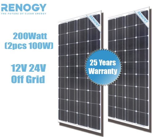 FeaturesTwo PCS of 100Watt solar Panel(total 200Watts), Renogy solar panels use the most premium components and 'Grade A' solar cells to ensure durability and High Modules Conversion Efficiency.Renogy solar panel is expandable with both series and parallel connectionRenogy 100 watt monocrystalline solar panel charges 12V battery and have guaranteed positive toleranceRenogy solar panels are framed in heavy duty anodized extruded aluminum with drainage/mounting holes and generate Excellent performance in low light environmentsDelivered ready for connection & Fast and inexpensive mounting 2pcs 100 W Watt 100W 100Watts Off Grid 12 Volt 12V RV Boat USA Solar Cells?